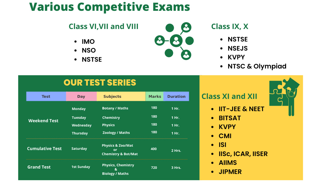 Foundation course is an effective course to start early preparation and build competitive spirit. The Foundation programme will start from 8th standard. The core fundamentals will be strengthened and it will be seemingly integrated with the NCERT syllabus. The curriculum is so designed to make the subject interesting, arouse the curiosity in the child and instill in them the passion for learning. This will further continue in classes in 9 and 10. Class XI & XII CBSE , NEET & JEE Integrated program will focus extensively in training students for various competitive exams through a well designed pedagogy and Test Series.
